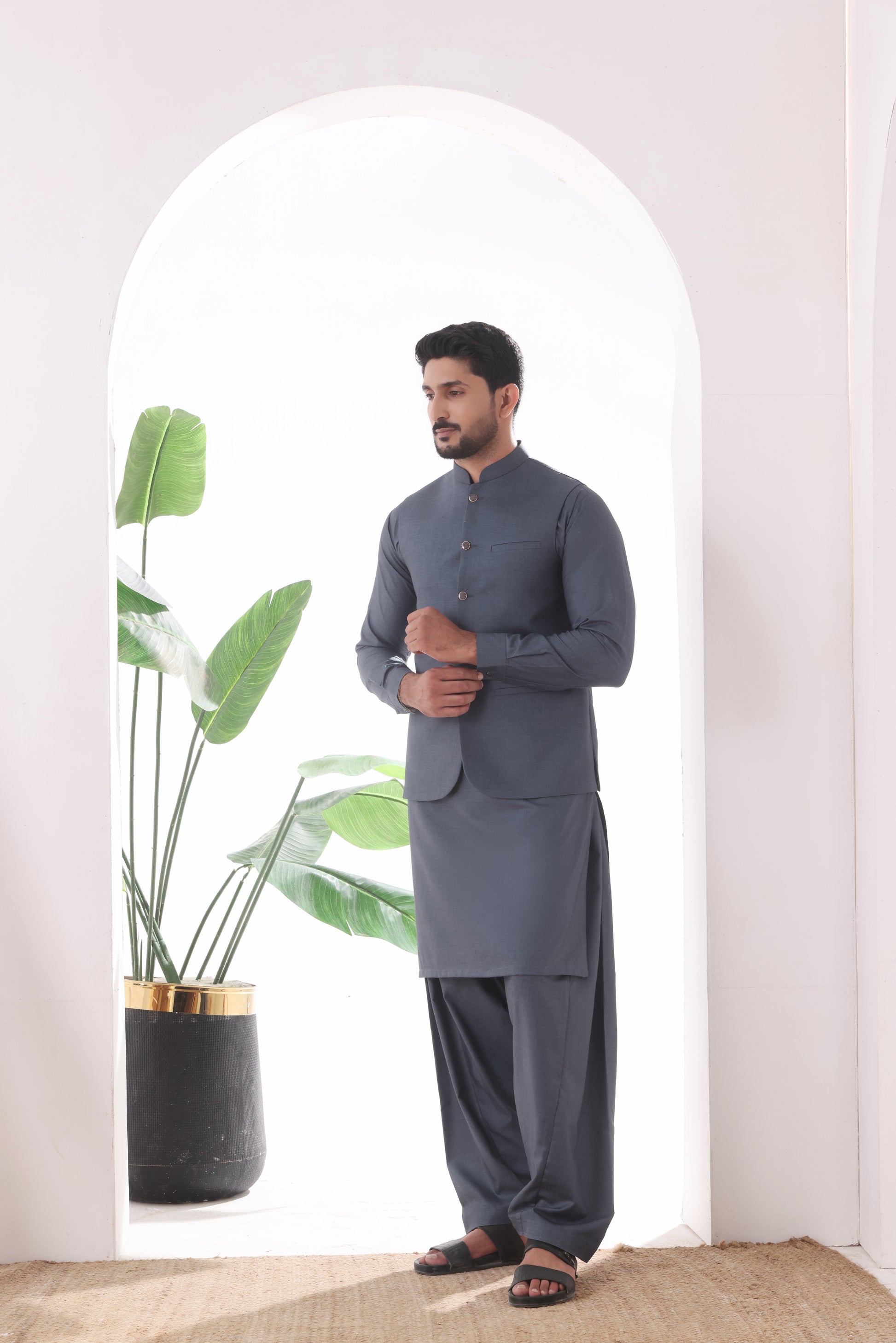 Signature winter Wear '25 Collection: Men's Formal Suiting Waistcoat paired with a Matching Blended Kameez Shalwar, designed to offer a refined and polished look for formal occasions. This sophisticated ensemble combines the timeless elegance of a tailored waistcoat with the comfort and versatility of a blended fabric, creating a perfect balance between style and practicality for the modern gentleman this winter season.