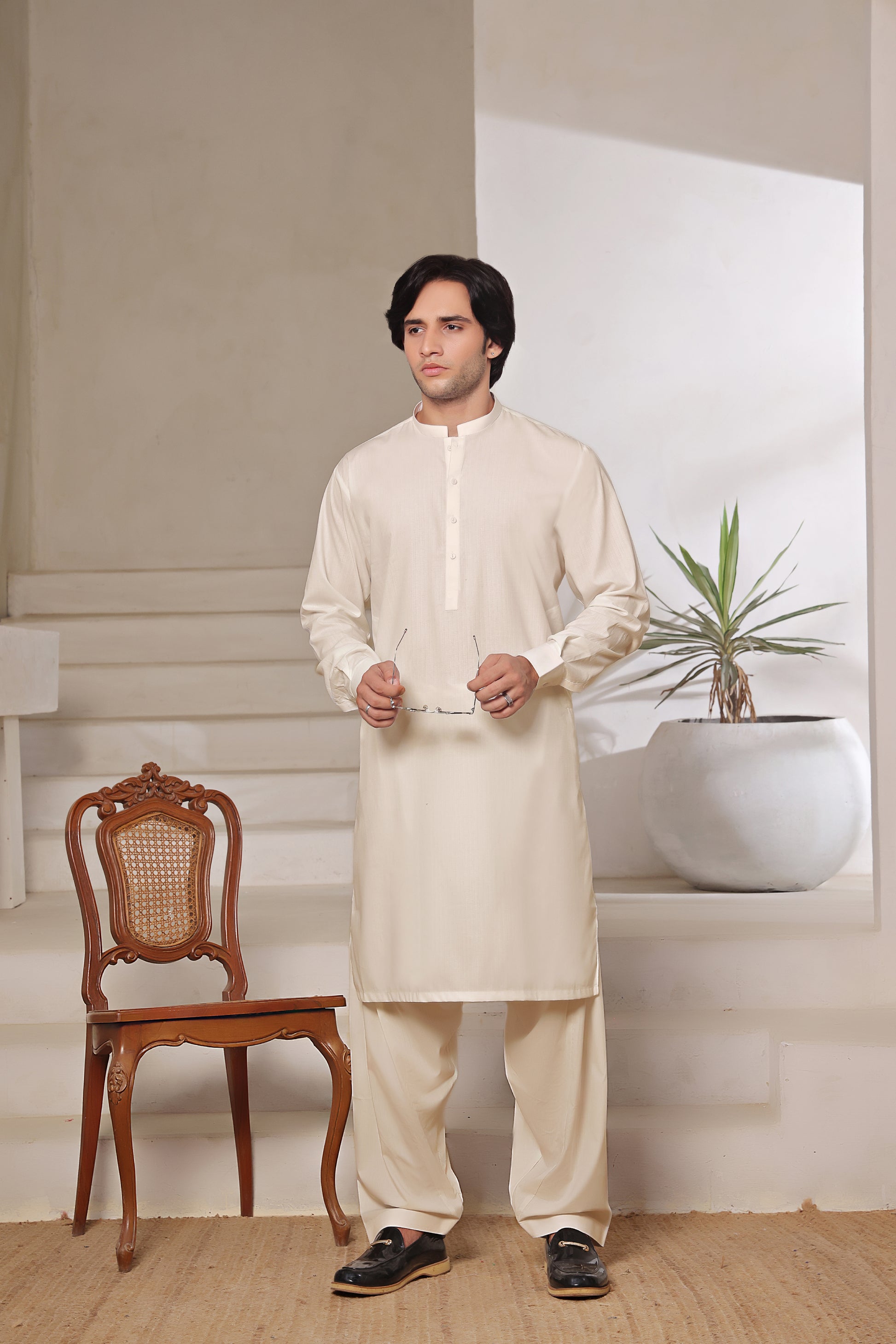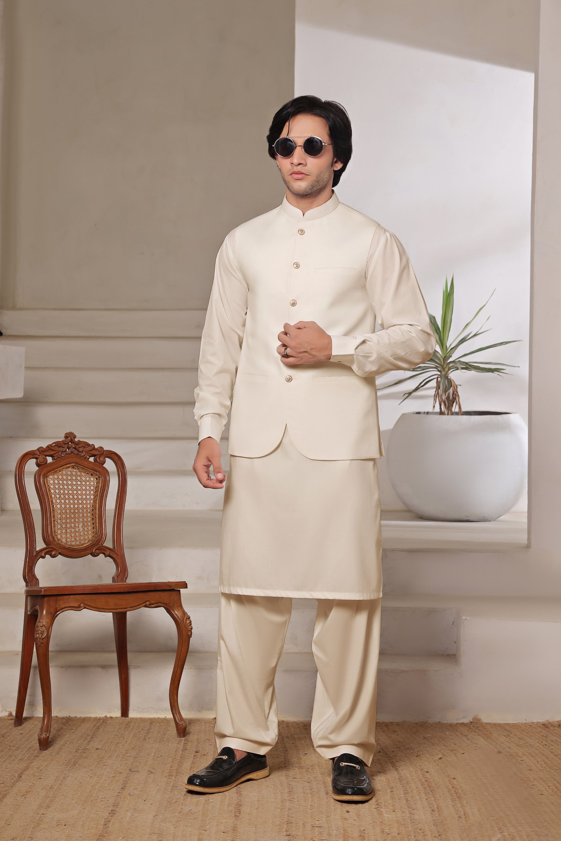 Signature SUMMER Wear '25 Collection: Men's Formal Suiting Waistcoat paired with a Matching Blended Kameez Shalwar, designed to offer a refined and polished look for formal occasions. This sophisticated ensemble combines the timeless elegance of a tailored waistcoat with the comfort and versatility of a blended fabric, creating a perfect balance between style and practicality for the modern gentleman this winter season.