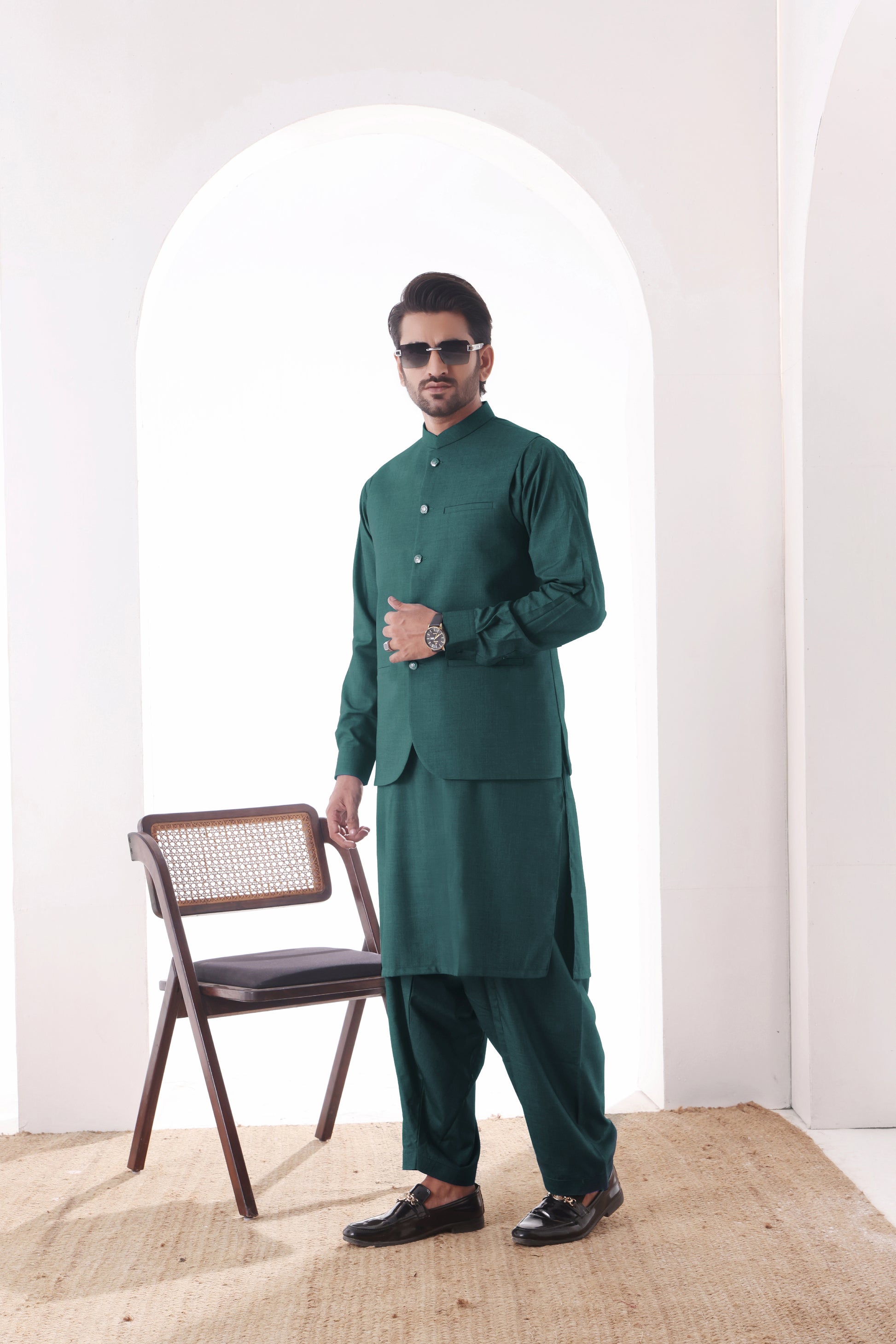 Signature winter Wear '25 Collection: Men's Formal Suiting Waistcoat paired with a Matching Blended Kameez Shalwar, designed to offer a refined and polished look for formal occasions. This sophisticated ensemble combines the timeless elegance of a tailored waistcoat with the comfort and versatility of a blended fabric, creating a perfect balance between style and practicality for the modern gentleman this winter season.